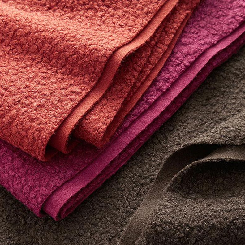 • BOUCLÉ: Ofte kan man se små knopper eller løkker i overfladen, som giver stoffet dets særlige struktur.