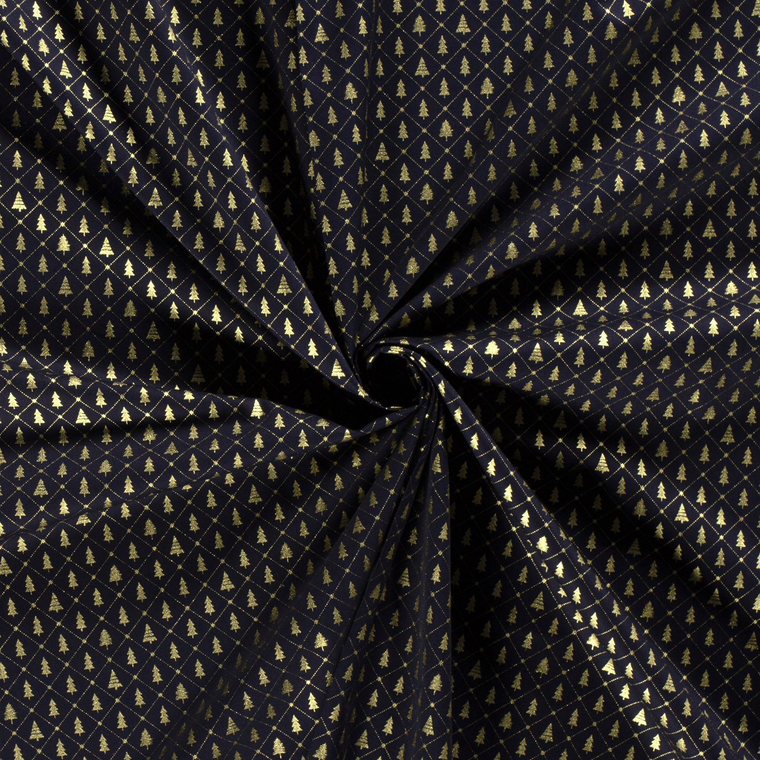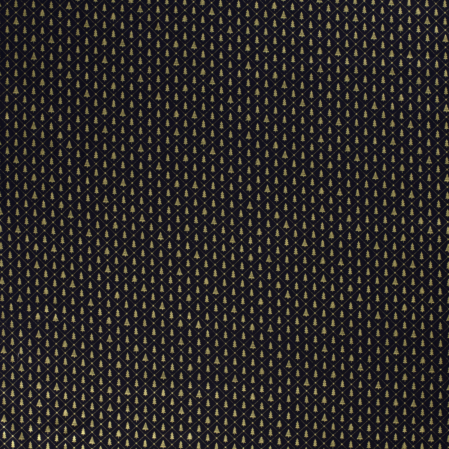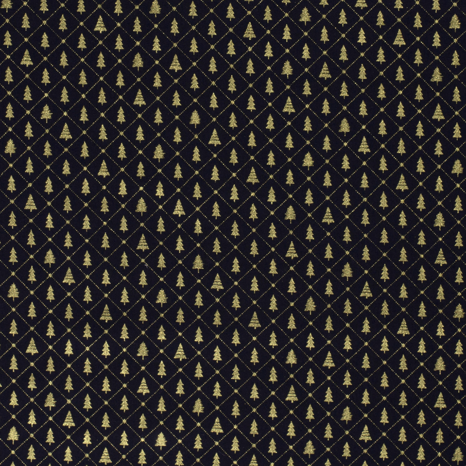 Et stof som en stille vinternat: På en dybblå baggrund stråler elegante juletræer i ædelt guld og varme naturlige nuancer. Fint tegnede grantræer, fine prikker som funklende snefnug og diskrete, grafiske detaljer giver designet et moderne, samtidig festligt udtryk.