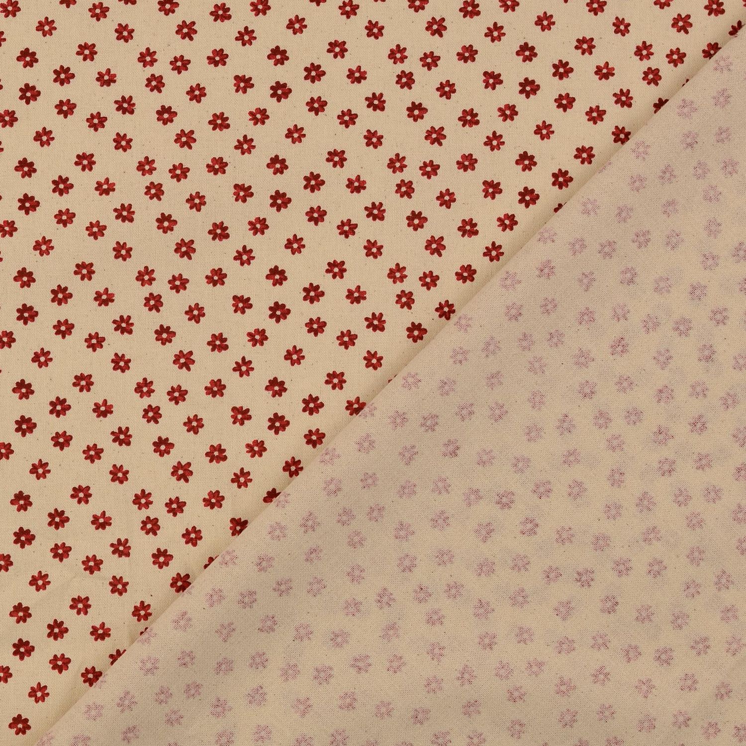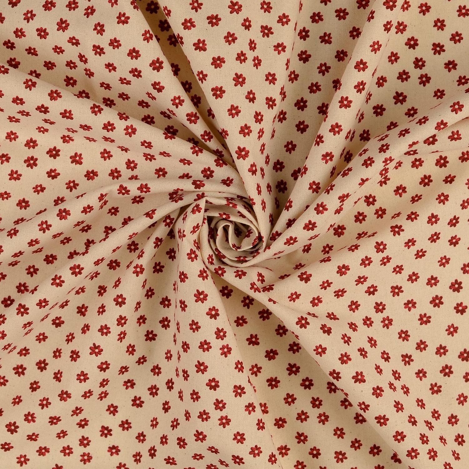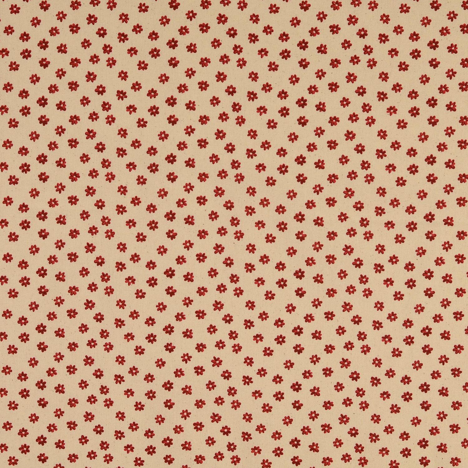 Et sart blomsterhav i varm beige tone: Denne cretonne fortryller med et fint allover blomsterprint i rød og creme, der minder om en romantisk landhave. De små blomster virker kærligt tegnede og fordeler sig jævnt over stoffet – perfekt til dem, der kan lide det legende, men ikke for farverigt.