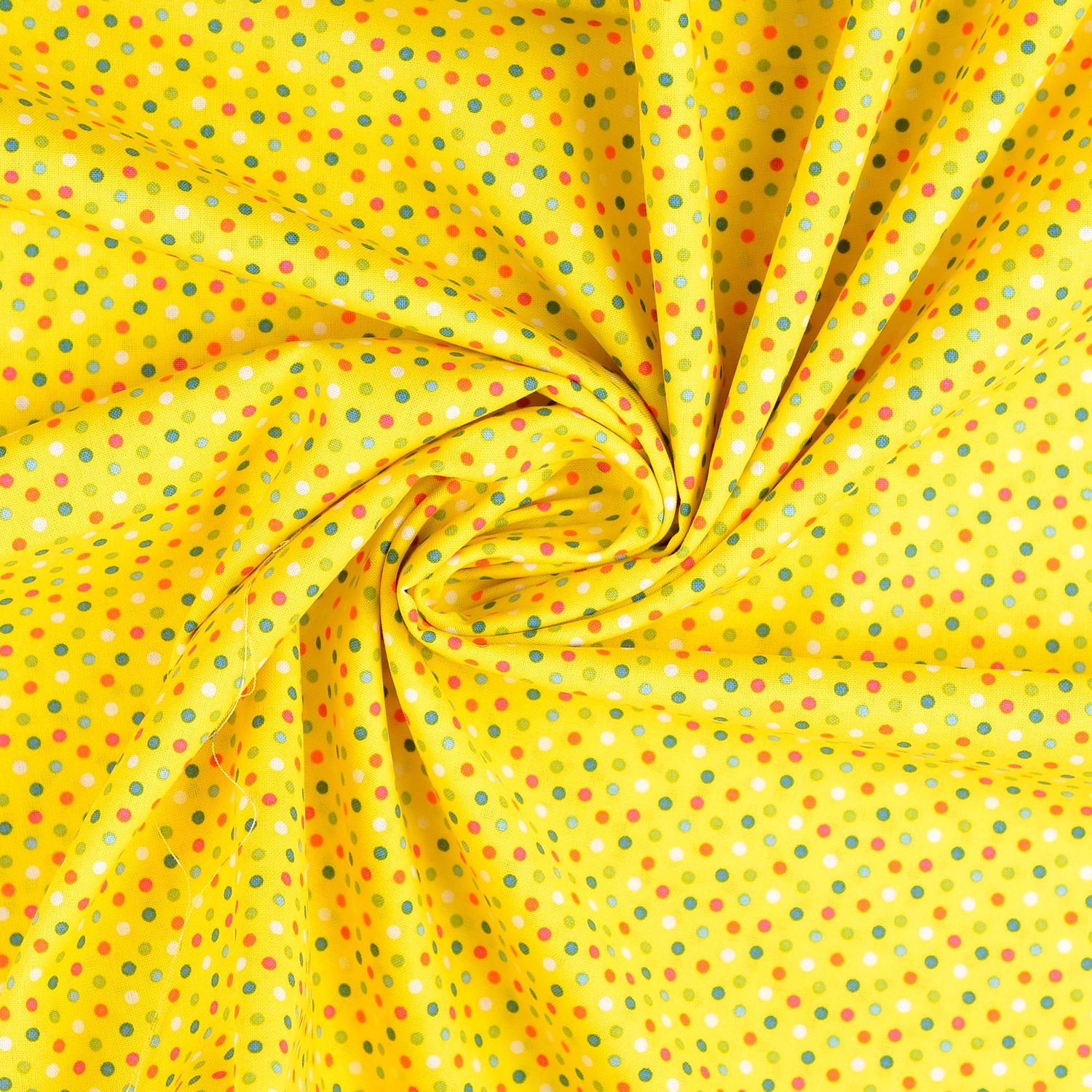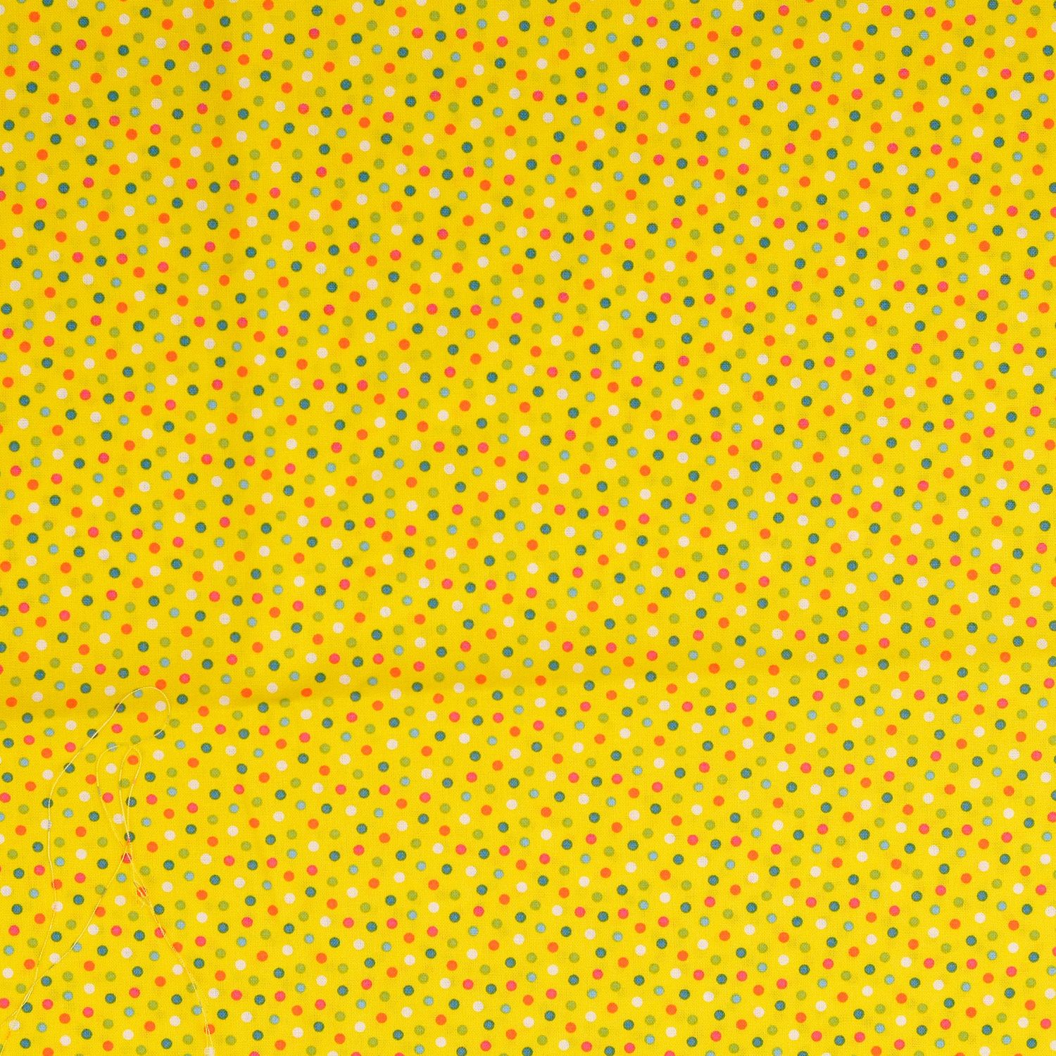 Dette glade prikkede stof udstråler godt humør ved første blik. På en solrig gul baggrund danser små, farverige prikker i frisk turkis, livlig rød, sart rosa, lys blå, dyb grøn og diskret grå – som farverigt konfetti til en sommerfest.