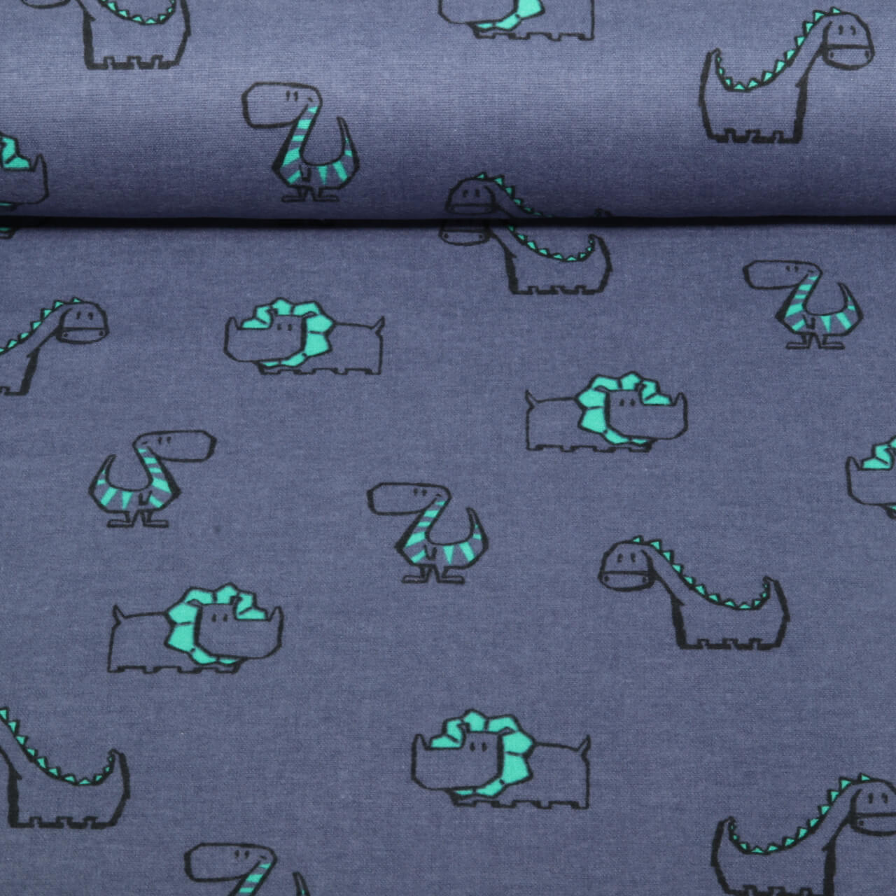 Den denimblå baggrund ser moderne og tidløs ud på samme tid og kan fint kombineres med ensfarvede stoffer i blå, beige eller naturlige toner. Perfekt til hyggelige pyjamasser, pyjamas, nusseklude, puder, børnesengetøj eller hyggetøj til små dinosaurfans.