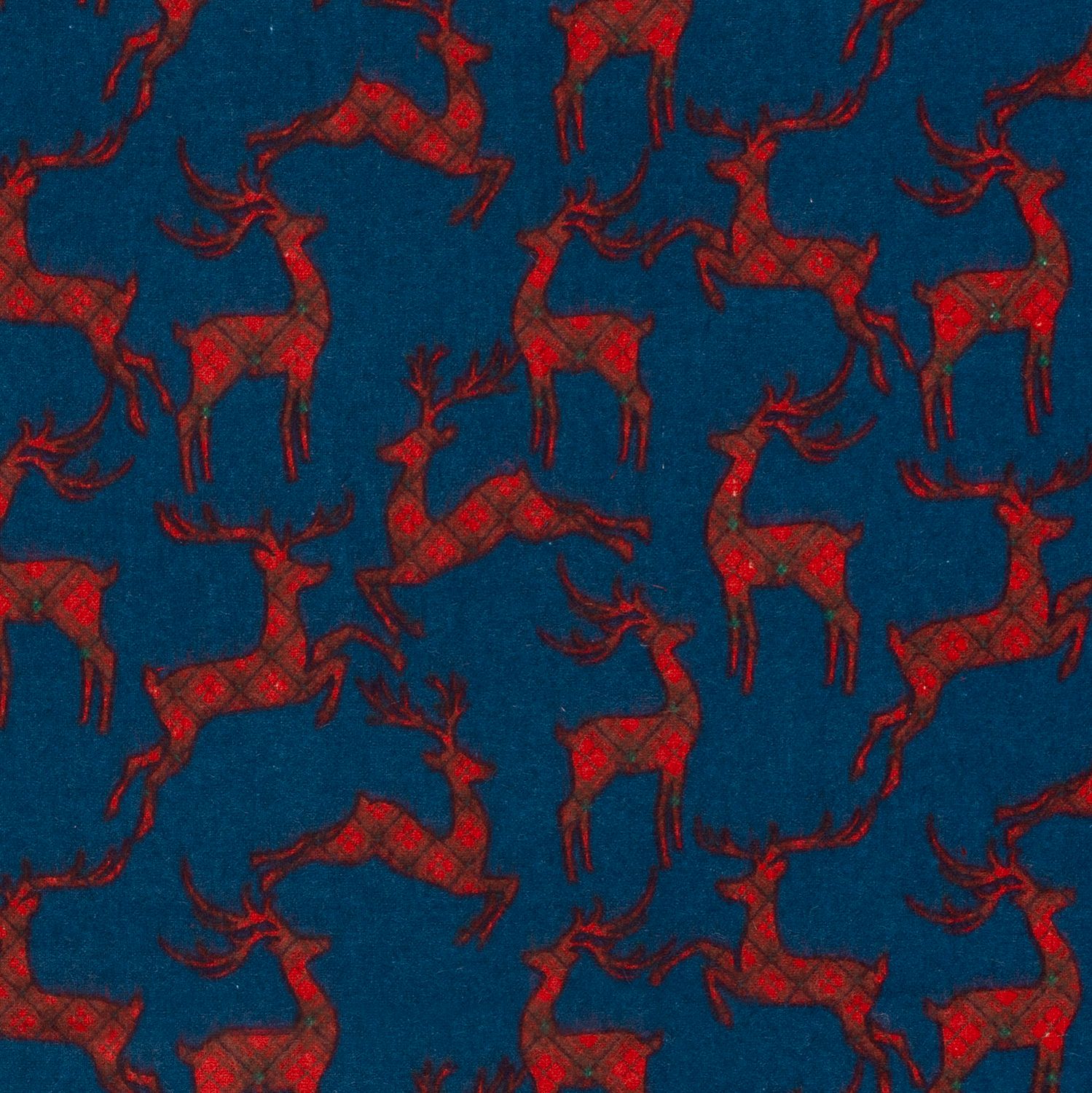 Hyggelig vintermagi til dine syprojekter: Dette bløde flannelstof viser et klassisk ternet mønster i blå og grå nuancer, gennemvævet med fine hvide og diskrete røde linjer. Mellem dem bevæger elegante hjortesilhuetter sig, som giver designet et kærligt, nordisk præg.
