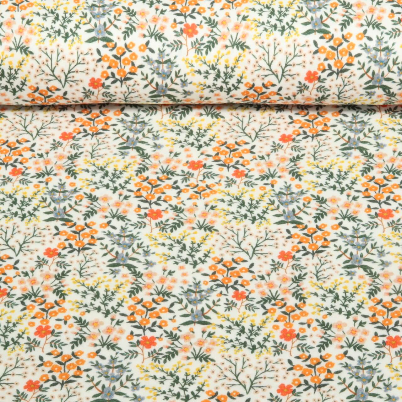 Så sart som en forårsbrise: Denne glatvævede muslin fortryller med en sofistikeret hvid baggrund, hvor sarte blomster blomstrer i varme naturfarver. Sarte blomster i sart rosa, dæmpet bordeaux, gylden gul og subtile grønne nuancer er spredt harmonisk ud over stoffet og minder om en drømmende sommerhushave.