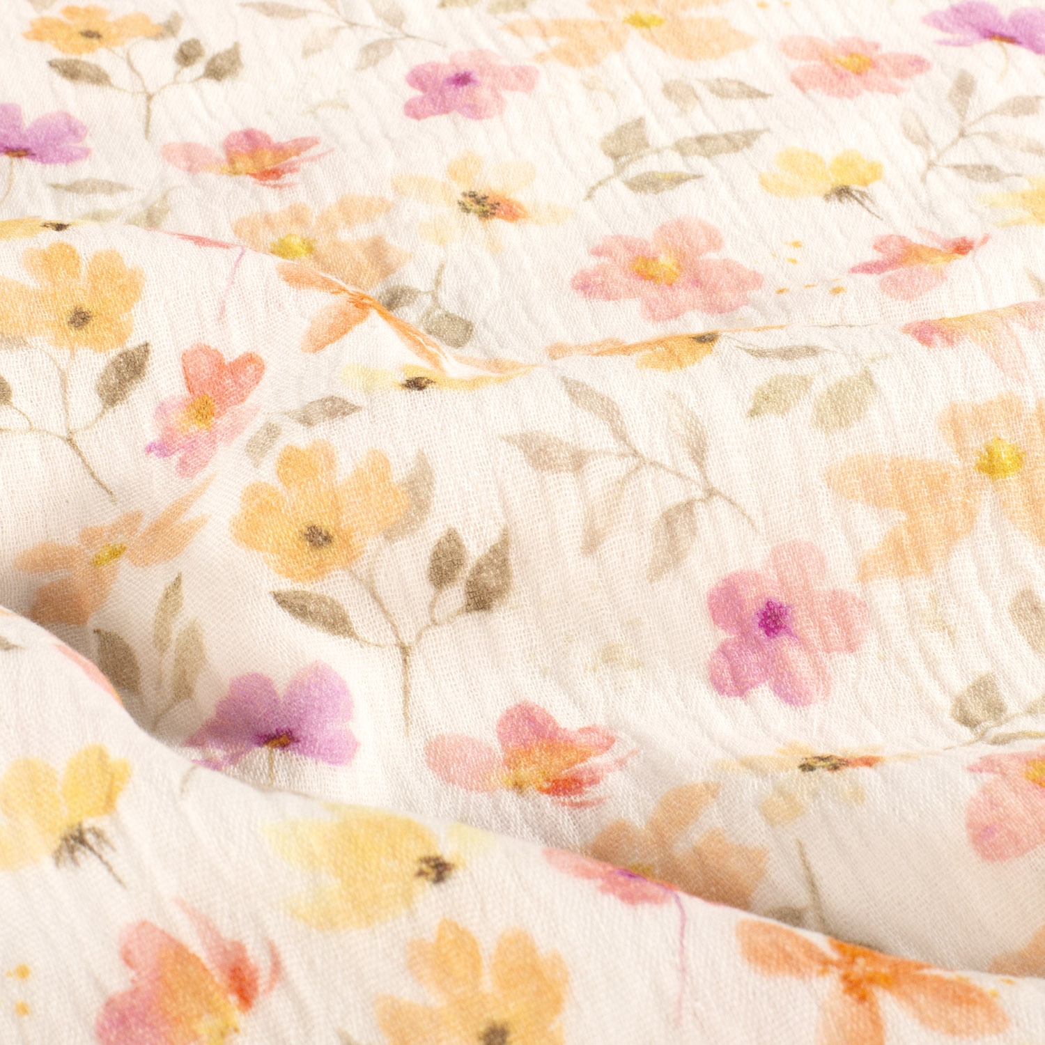 Den let strukturerede krinkel-effekt i musselinen understreger det afslappede og naturlige look og giver det florale design liv. Ideel til luftige bluser, tunikaer, kjoler, tørklæder, baby- og børnetøj, tæpper eller accessories – overalt hvor du søger en blanding af lethed, komfort og romantisk flair.