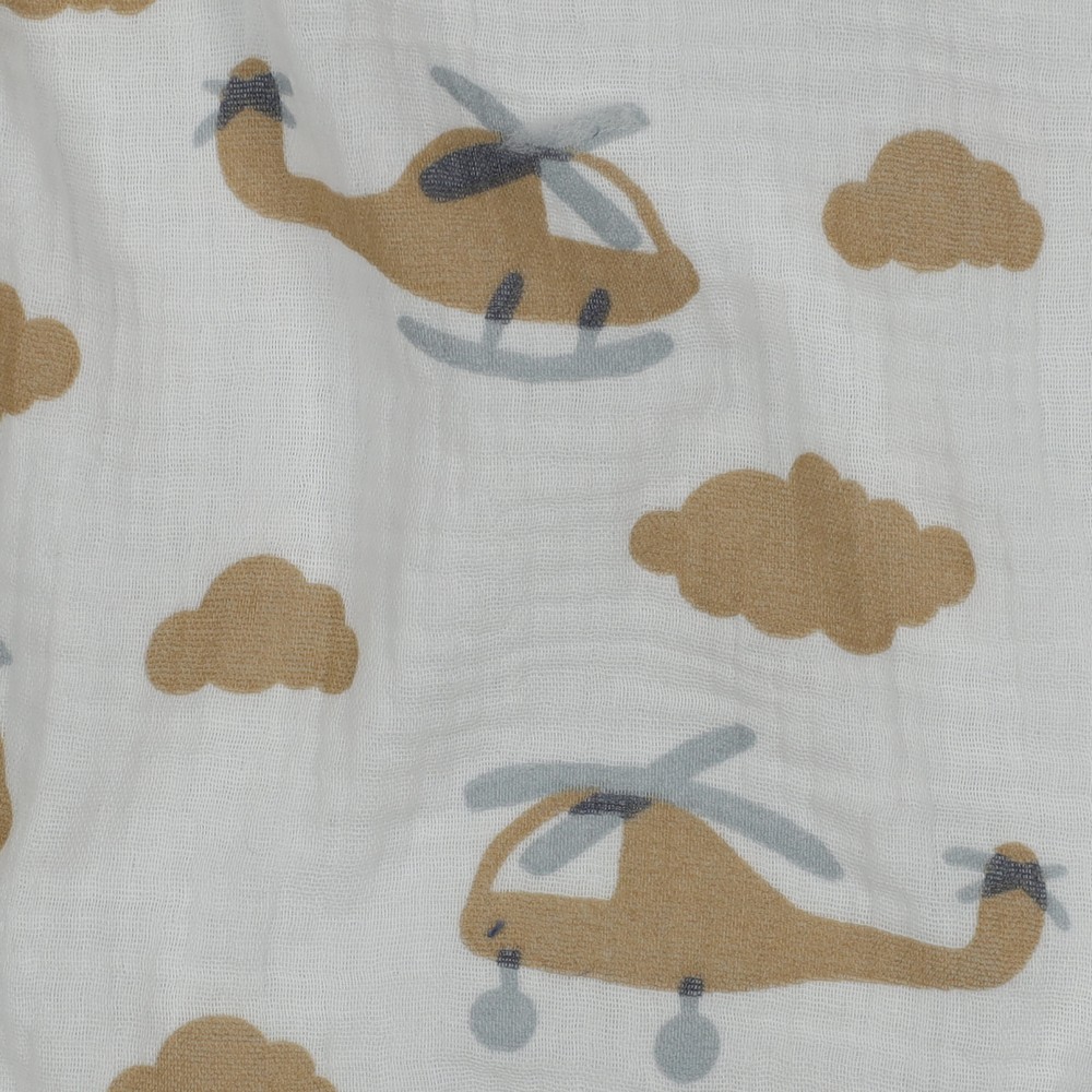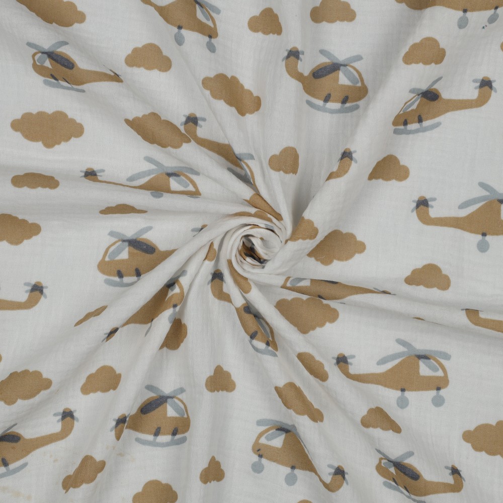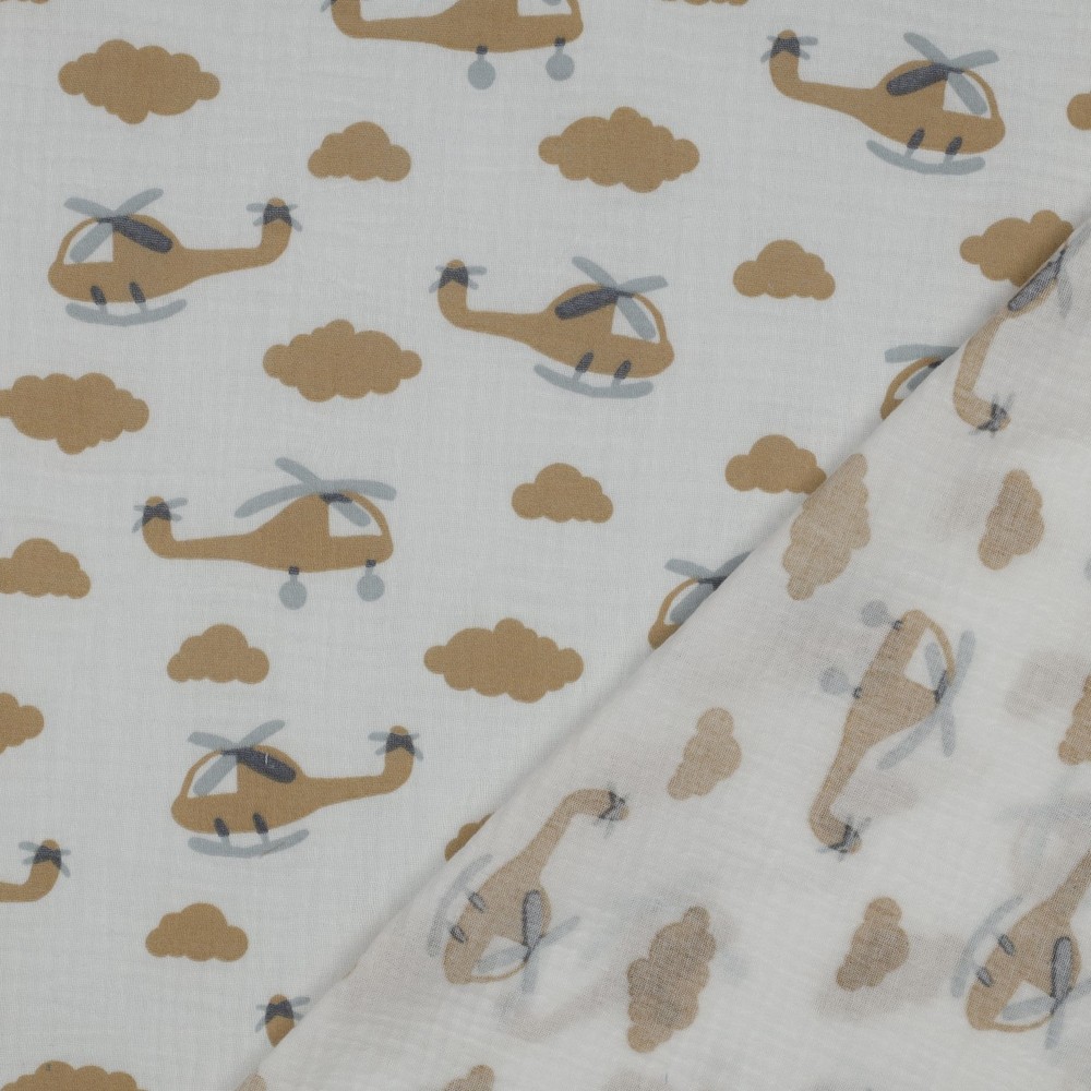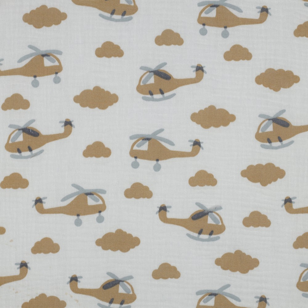 Et stof som skabt til små opdagelsesrejsende! På den sarte ecrufarvede baggrund flyver kærligt illustrerede helikoptere i bløde blå og grå toner over stoffet – mellem dem små skyer og detaljer, der straks vækker lyst til nye eventyr.