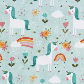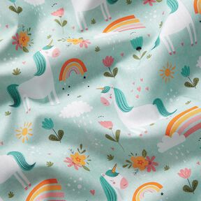 Bomuldspoplin enhjørning i regnbueverdenen Digitaltryk – isblåDKK 90,95 / m (DKK 60,63 / m²)