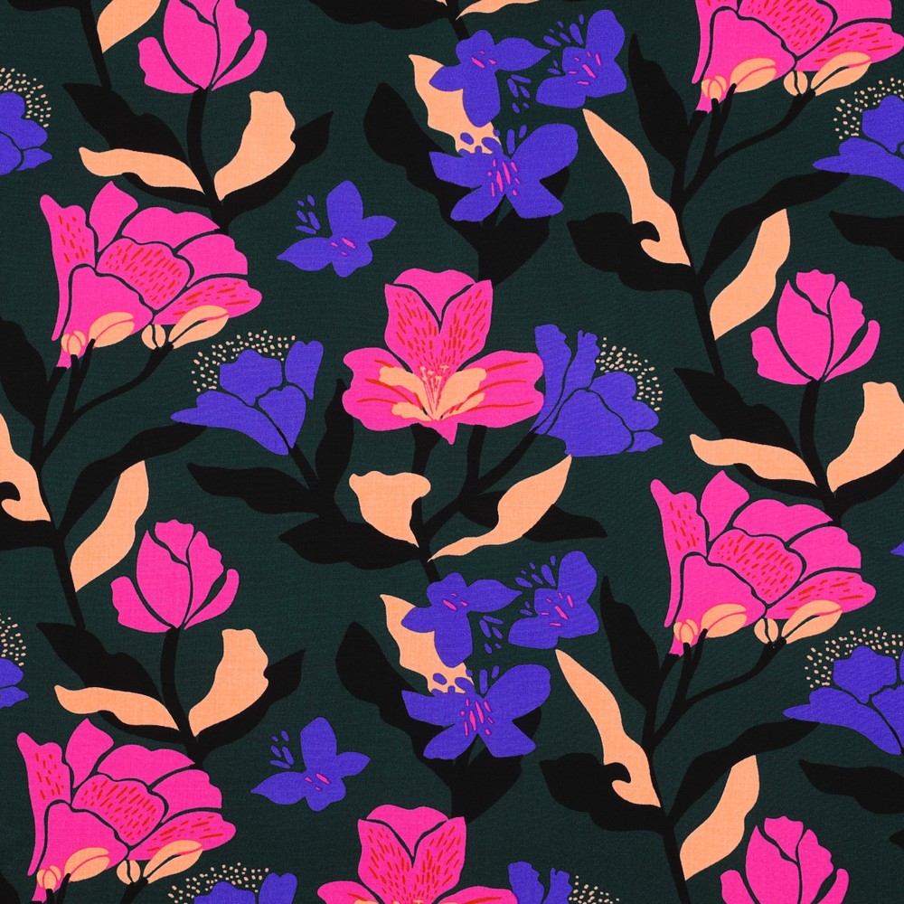 En mørk, fyldig grangrøn danner rammen om et muntert blomsterhav: sarte blade, stiliserede blomster og legende former danser hen over stoffet i varme nuancer af rosa, abrikos og creme. Subtile accenter i sennepsgul og bløde pastelfarver vækker blomstermønsteret til live uden at overdøve det.