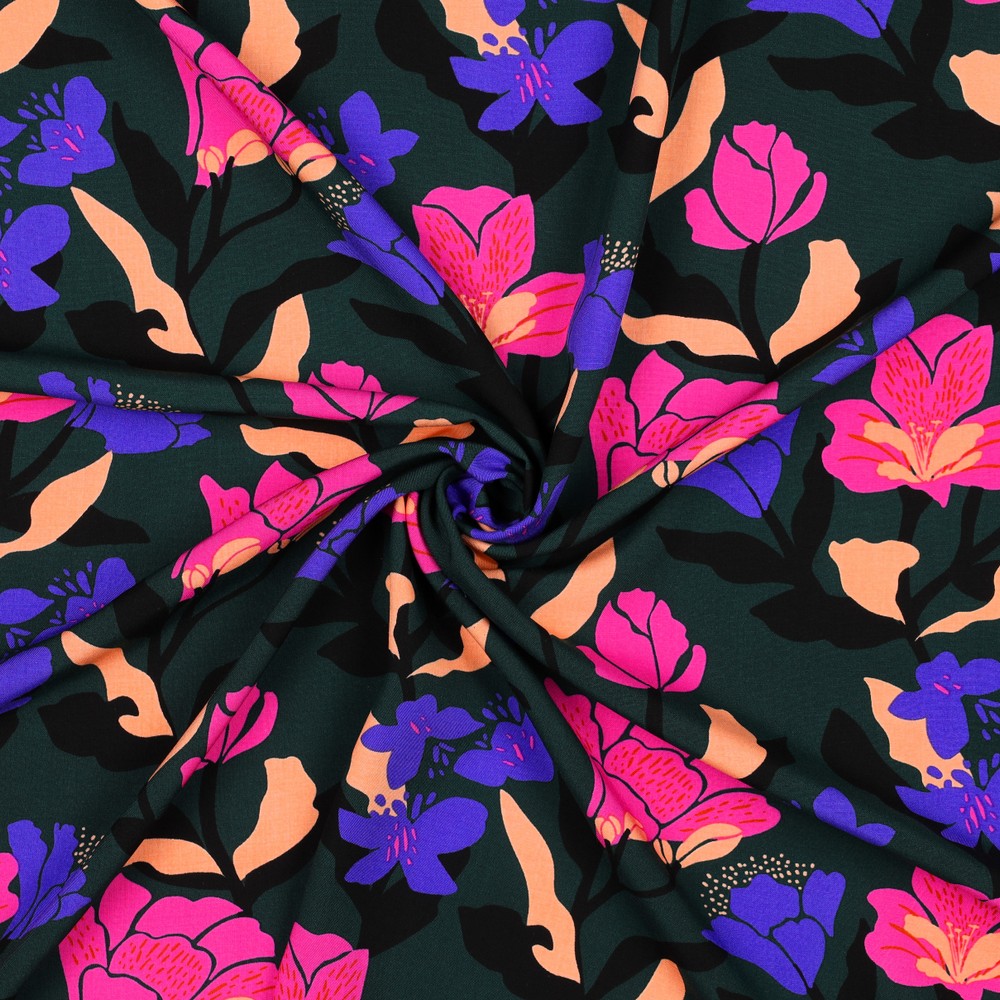 Det moderne, grafisk inspirerede design er typisk for Nerida Hansen: kreativt, kunstnerisk og vidunderligt anvendeligt på samme tid. Uanset om det er flydende kjoler, feminine bluser, brede bukser eller afslappede nederdele - dette stof giver ethvert projekt et særligt præg. Den mørke baggrund får farverne til at træde særligt godt frem og gør dine hjemmesyede yndlingsstykker til ægte blikfang - både til hverdag og til særlige lejligheder.