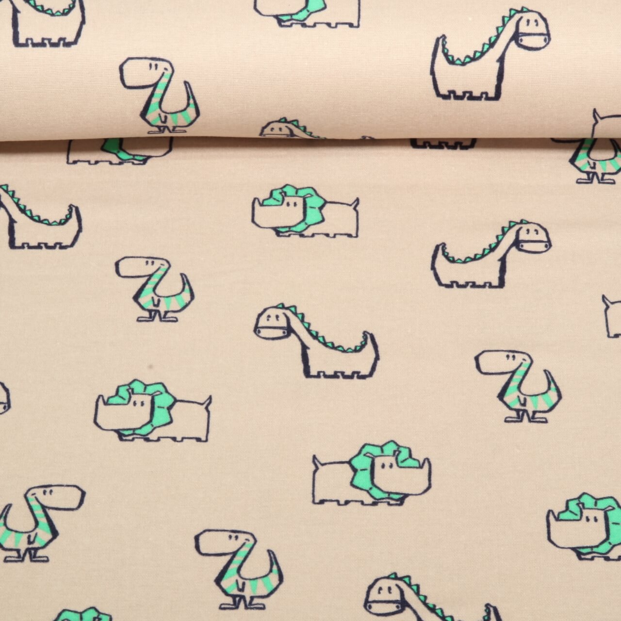 Lækkert blødt og nemt at forelske sig i: Dette flonelstof i varm beige er trykt med muntre dinosaurer, som straks får dig i godt humør. De søde dinosaurer i bløde nuancer af grøn og brun kombineret med små detaljer i diskret blå og orange ser legende ud, men ikke for farverige - perfekt til børn, der elsker dinosaurer, og til alle, der kan lide en hyggelig atmosfære.