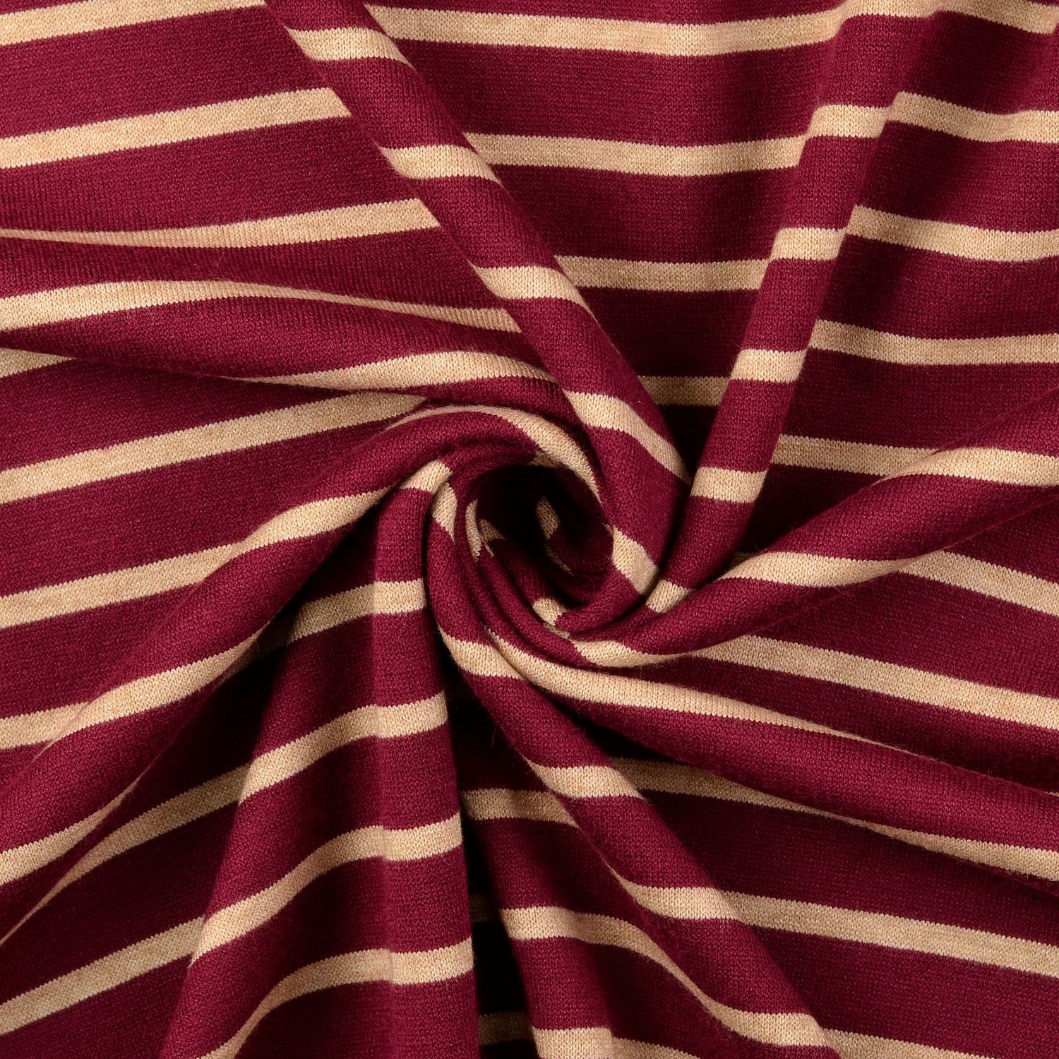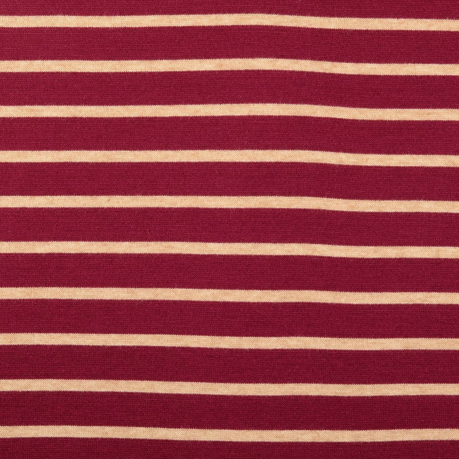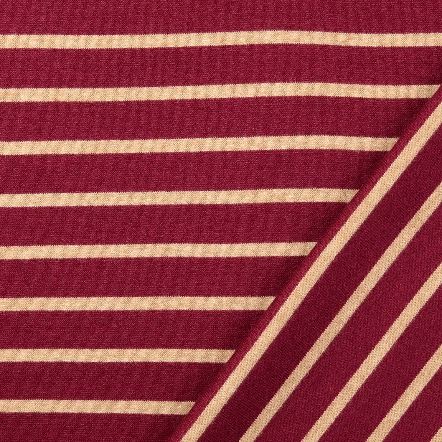 Et stof som din yndlingsstriktrøje: Vores jacquard strikjersey i bordeaux og beige begejstrer med sit elegante stribemønster og en vidunderligt hyggelig strikket look. De fine, regelmæssige striber virker moderne og tidløse på samme tid – perfekt til alle, der elsker enkel elegance med et strejf af varme.