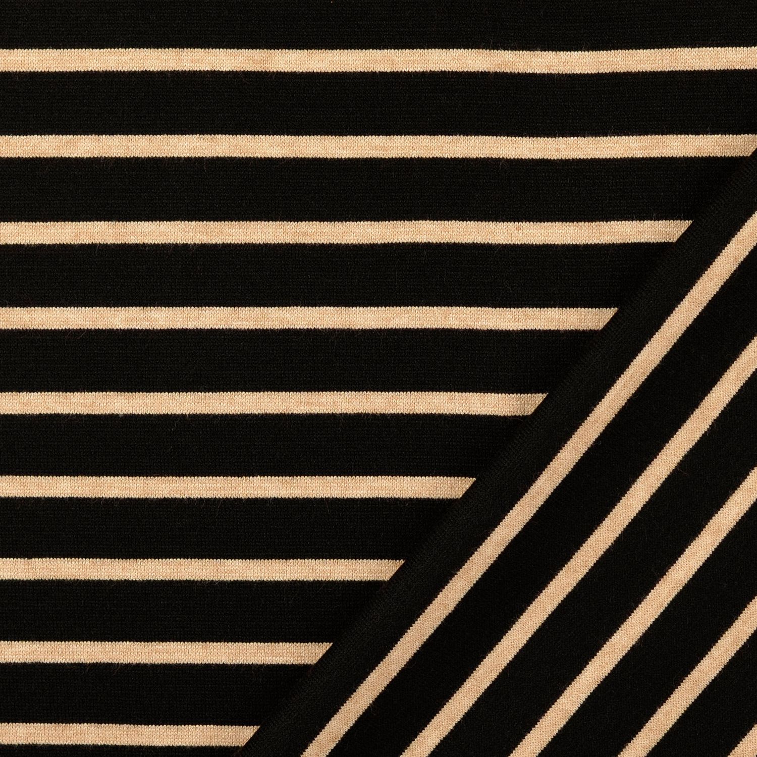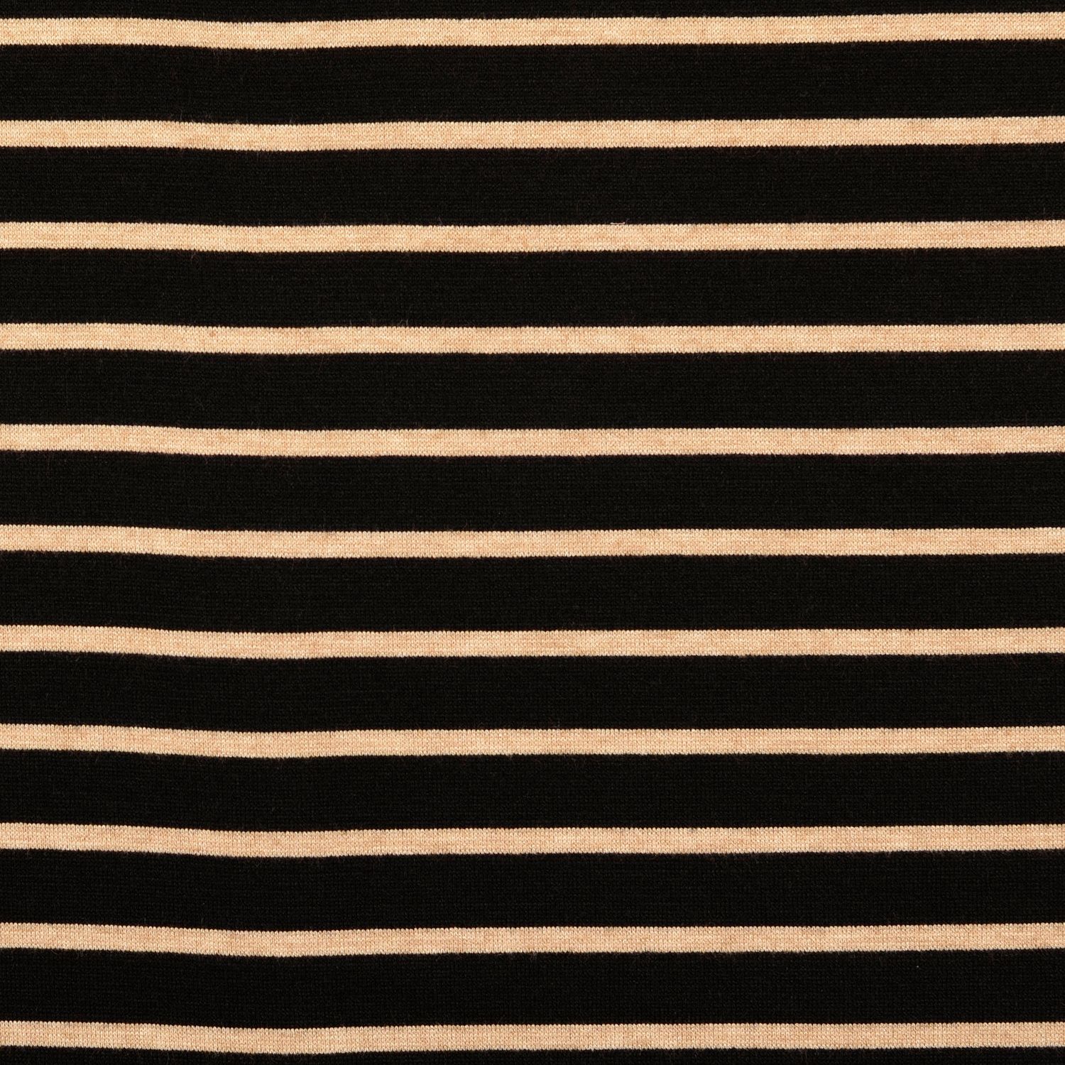 En tidløs klassiker med et moderne twist: Denne jacquard strikkede jersey begejstrer med klare, længdegående striber i sort og varm beige. Den fine strikkede struktur giver mønsteret en elegant dybde – de mørke striber fremstår ædle og definerede, mens beige blødt skaber kontraster og giver designet en naturlig, rolig tone.