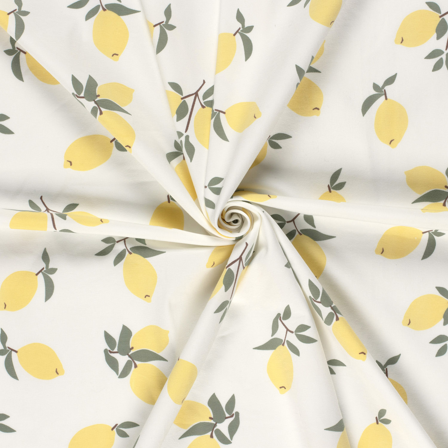 Frisk, frugtig og simpelthen til at bide i: Denne jersey med sarte citroner på en uldhvid baggrund bringer straks sommerstemning til dine syprojekter. De små, gule citroner med fine grønne blade virker lette, glade og samtidig stilfulde – perfekt til dem, der kan lide det legende, men ikke for farverigt.