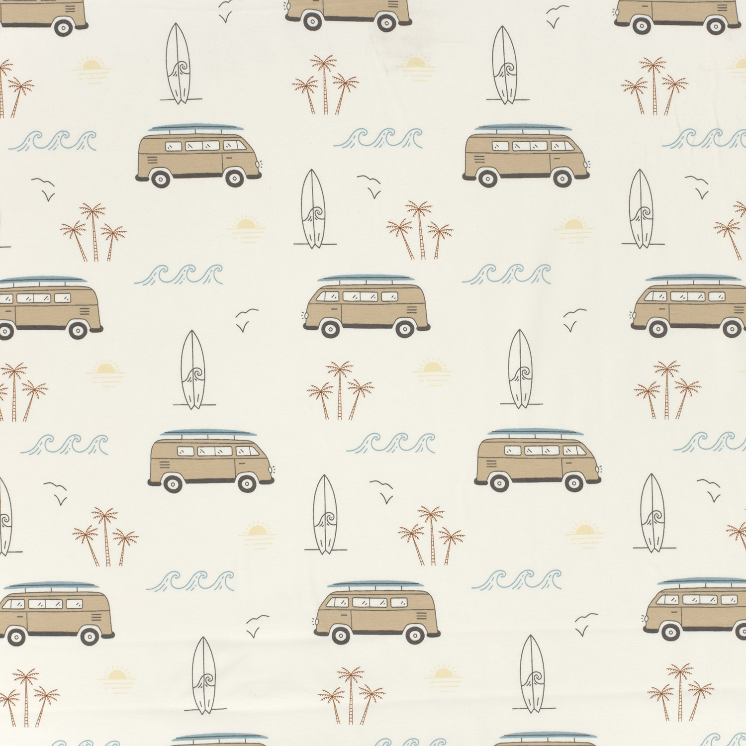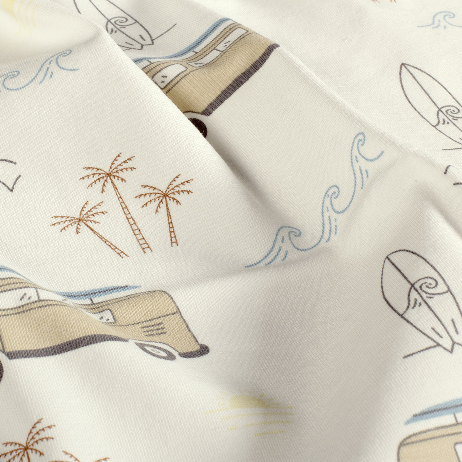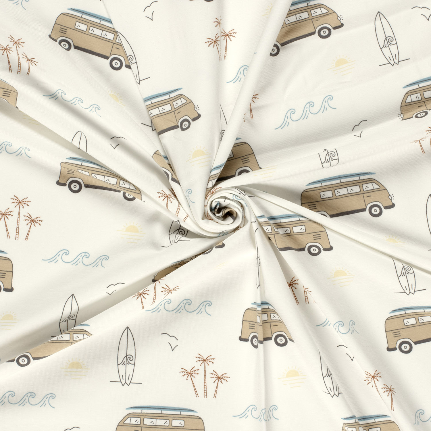 Stoffet er ideelt til sommerlige t-shirts, behagelige bukser, kjoler, bukser med elastik, pyjamas eller sødt børnetøj. Også accessories som huer, loops eller lette tæpper bliver med dette motiv et ægte blikfang. Perfekt til alle små og store eventyrere, der elsker at rejse – eller bare vil bringe lidt feriestemning ind i hverdagen.