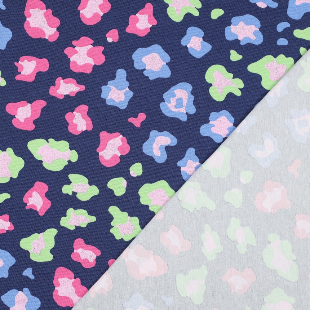 Denne jersey bringer glamour ind i din garderobe: Et moderne leopardprint i forskellige blå og petrol nuancer møder funklende glitereffekter, der diskret skinner ved hver bevægelse. Den mørke, let melerede grundfarve får leopardmønsteret til at træde elegant frem og sikrer, at stoffet både virker afslappet og eksklusivt.