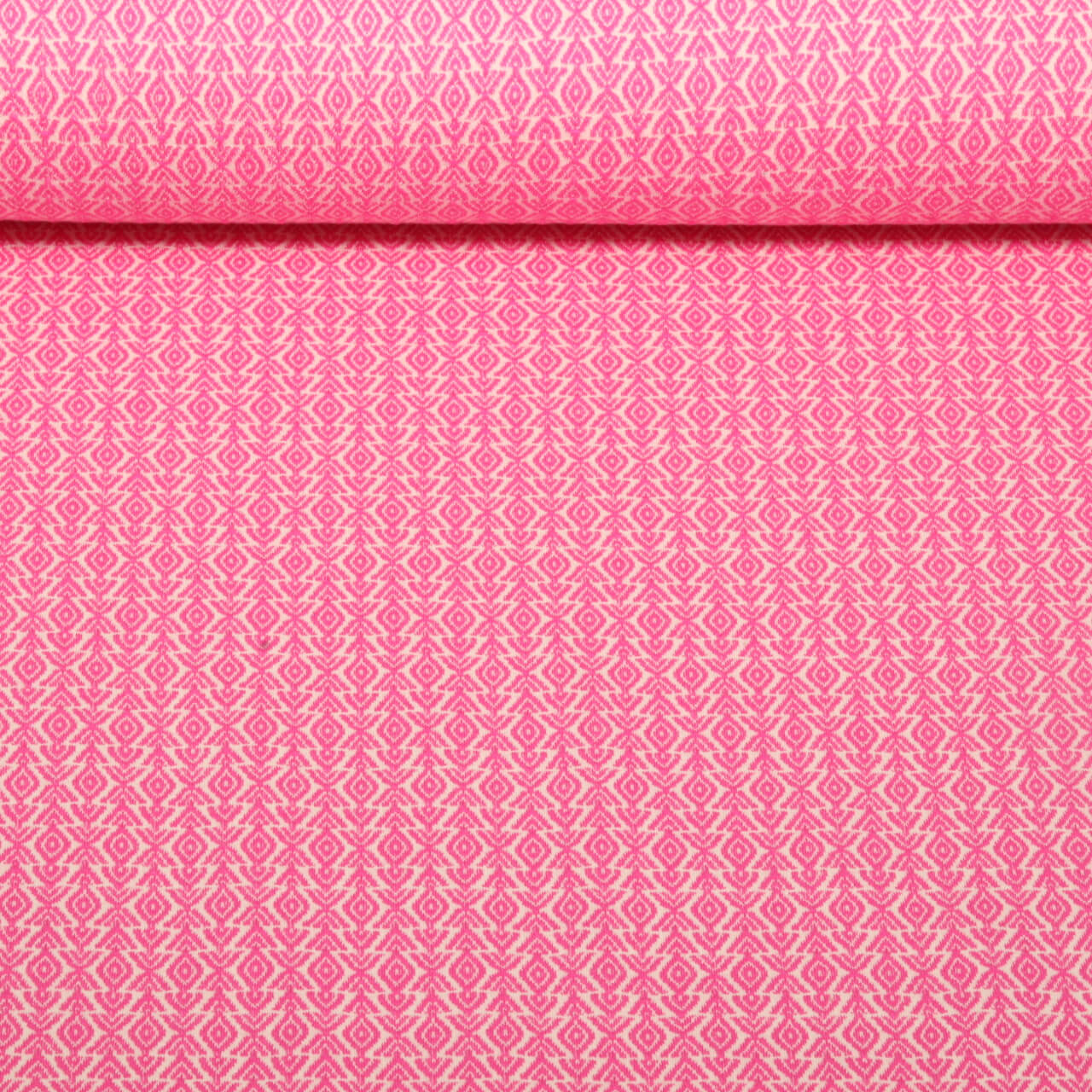 Denne drømmeagtige jacquardjersey vil tage dig med til en magisk western-eventyrverden. Kærligt illustrerede motiver på en sart rosa baggrund: små cowgirls, heste, kaktusser, tipier og legesyge detaljer, der minder om eventyrlige historier under åben himmel. Den bløde jacquardstruktur giver stoffet et sofistikeret, let tredimensionelt udseende og gør designet særligt livligt.
