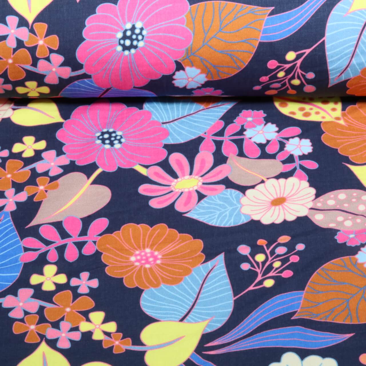 Denne elegante organiske musselin fortryller med en dyb marineblå bundfarve, hvor sarte blomsterornamenter skinner som små lysreflekser. Delikate blomster, blade og legende detaljer løber i harmoniske buer hen over stoffet og giver det et elegant, let legende look.
