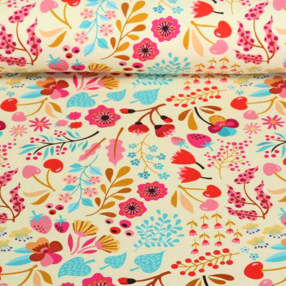 Et stof som en sommerdag i parken: En dejlig picnicscene med masser af små, detaljerede motiver udfolder sig på den bløde ecru-farvede baggrund. Du finder friske jordbær, sprøde baguetter, vindruer, ost, limonade, små knive, glas og flasker - alt ser ud, som om picnickurven lige er blevet pakket ud.