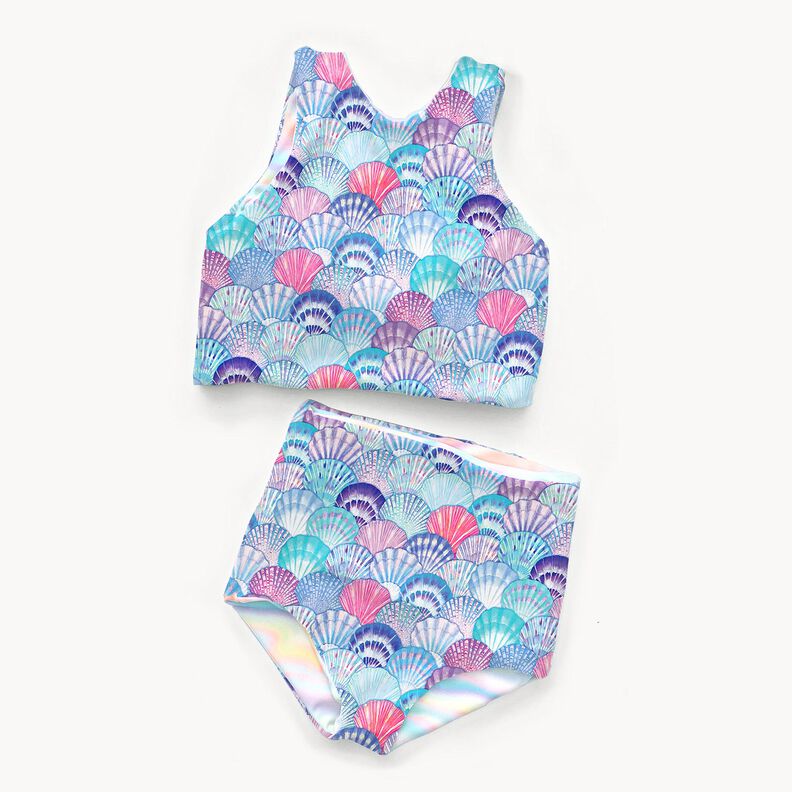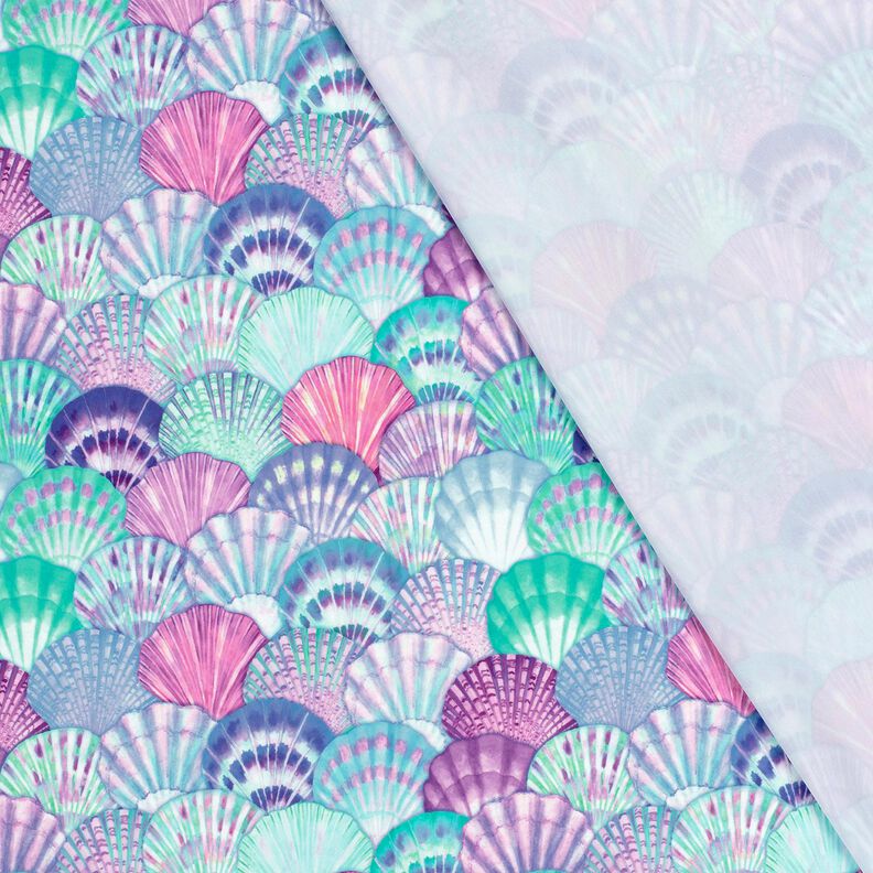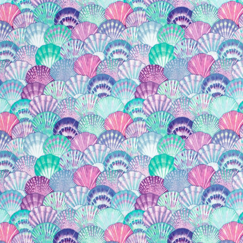 Badetøjsstof UPF50 Muslinger – aquablå/blålilla