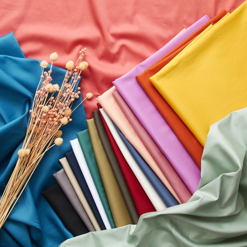 Denne luftige bomuldssatin imponerer med sin lethed og finhed. Stoffet falder smukt og føles glat. På grund af sin specielle vævning har stoffet en let glans. En luftig sommerkjole eller en let bluse bliver dine tro følgesvende på en solrig sommerdag!