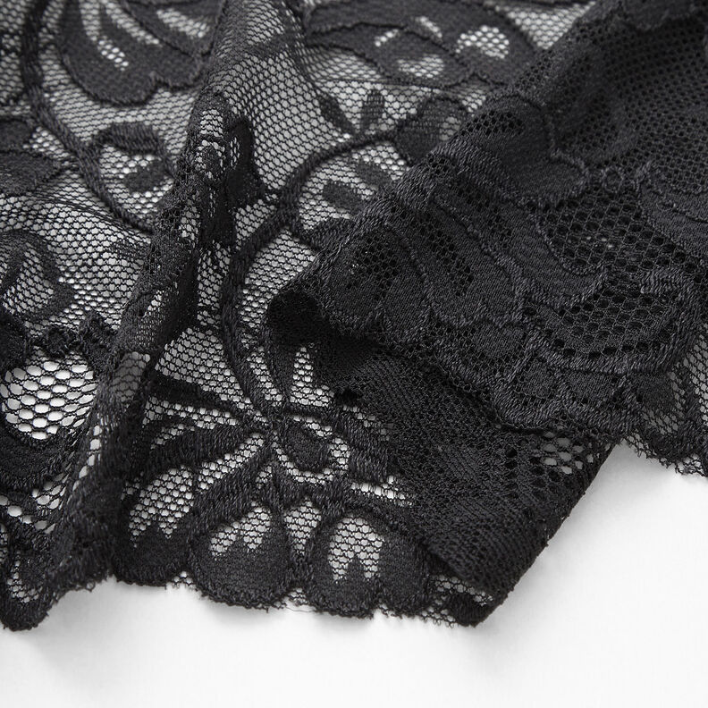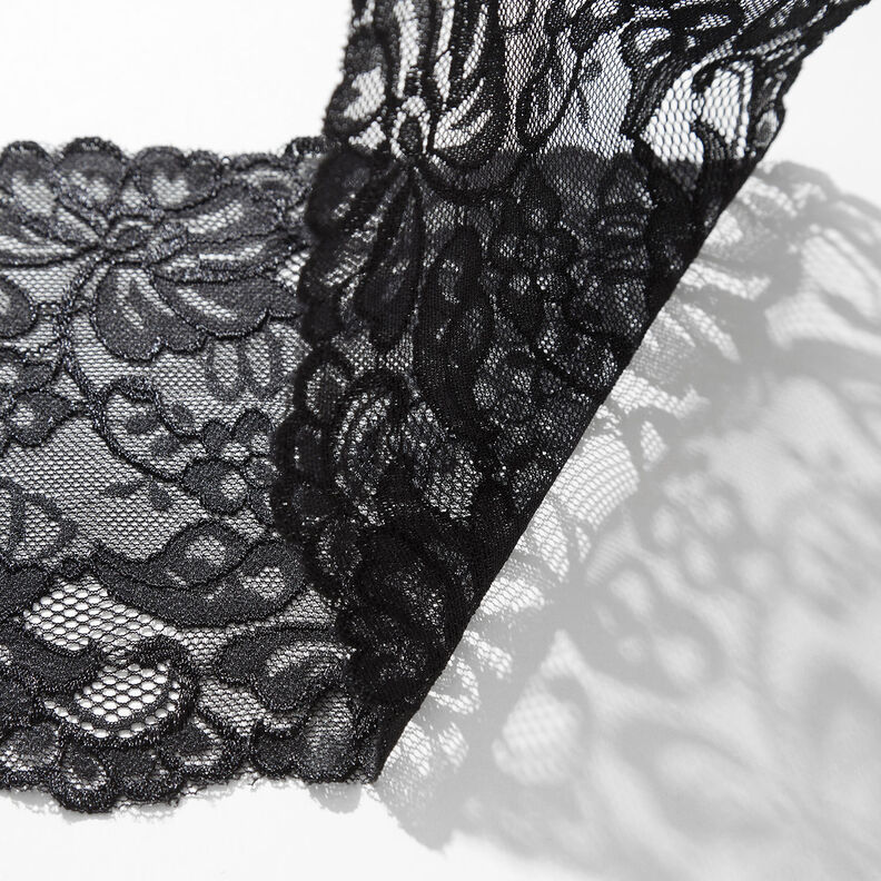 Fin elastisk blonde med skønt blomstermønster og buekant, kan vendes til specielle syprojekter og er ideel til at lave undertøj og diverse lingeri.