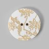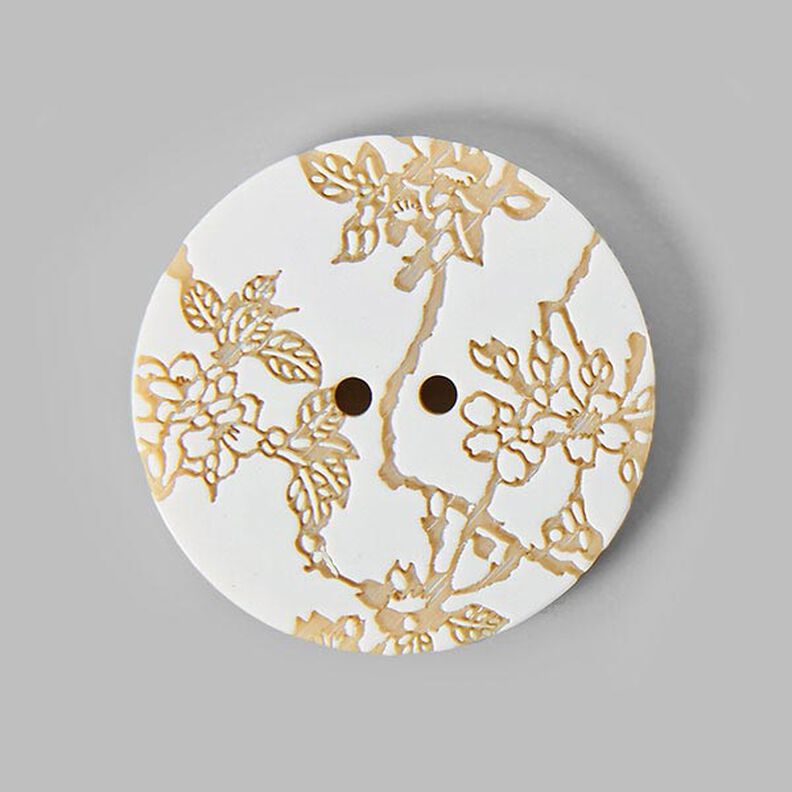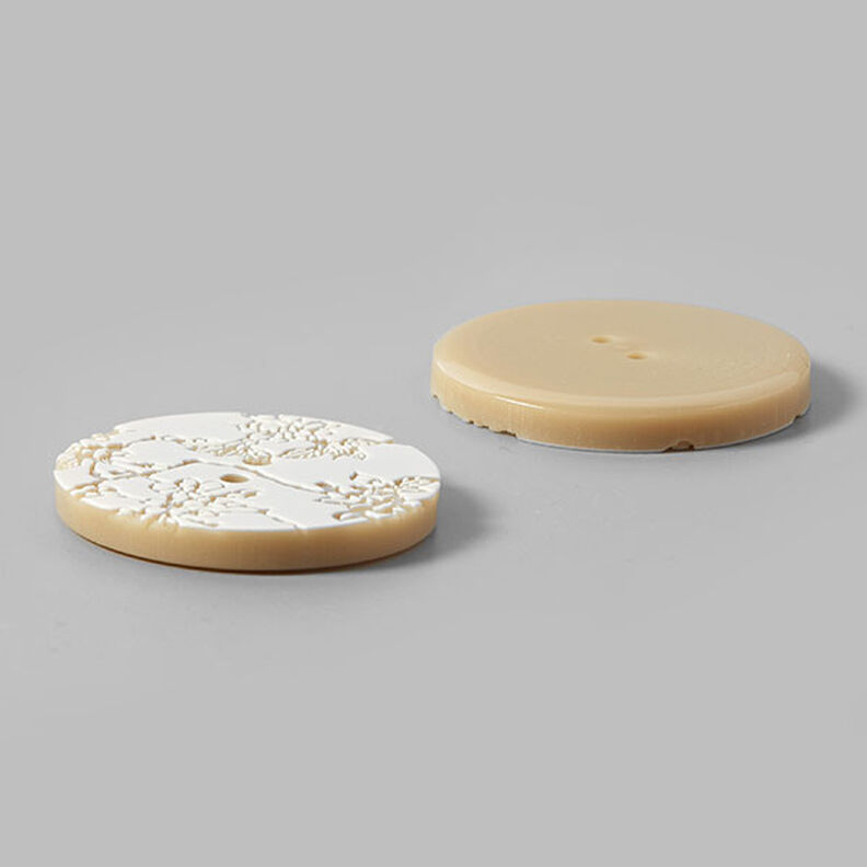 Silkemat tohulsknap med prægning i blomstermotiv. Smuk som knap på frakker, strikjakker, samt smykkeknap på sjaler og huer.