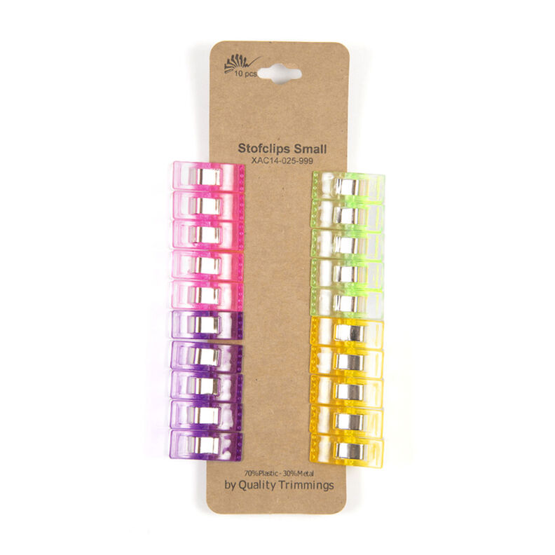 Spraglede og praktiske stofklemmer i forskellige farver. Ideel syhjælp til at sætte to stykker stof sammen. Klemmerne er gennemsigtige, så stoffet er synligt mens det sys.