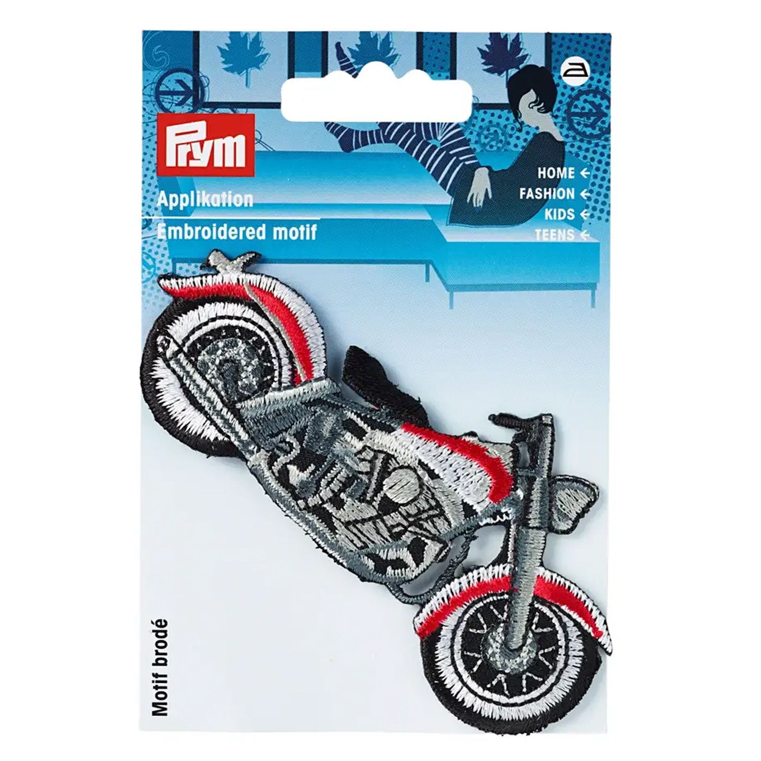 Med Prym Patch "Motorcykel" får ethvert stykke tøj et cool biker-look. Den detaljerigt udformede motorcykel i kraftig rød, sølv og sort skiller sig markant ud fra den mørke baggrund og virker som et lille påsyningsmærke i vintage-racing-stil.