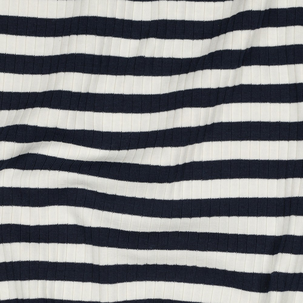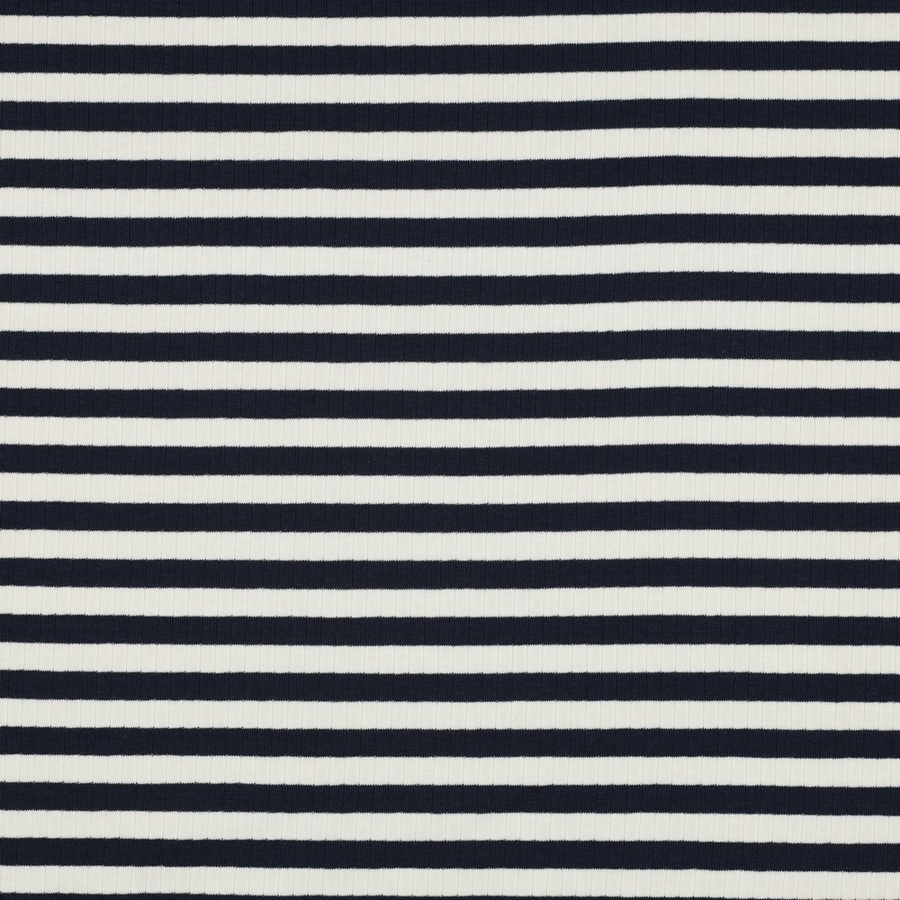 Tidløs, maritim og vidunderligt hyggelig: Denne ribbede jersey vil glæde dig med sine fine, jævne striber i klassisk navy og blød ecru. Det garnfarvede stof får farverne til at se særligt klare og elegante ud - intet ser kunstigt ud, alt smelter harmonisk sammen.