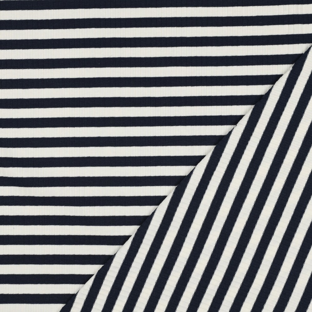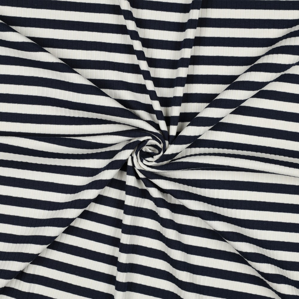 Uanset om det er sporty og navy til hverdagsbrug, casual med jeans eller som et fint blikfang i børnekollektionen: Med denne ribbede jersey i navy- og ecru-stribemønster kan du sy tidløse basics, som altid vil være moderne.