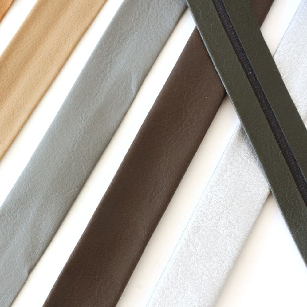 Dette elegante skråbånd i kunstlæder giver dine syprojekter et professionelt look i høj kvalitet på ingen tid. Den fine, let kornede overflade minder om ægte læder og ser moderne og tidløs ud på samme tid. Produktbilledet viser skråbåndet i stilfulde, alsidige farver: varm camel, blød greige, elegant mørkebrun, dyb oliven samt lys creme og sølvgrå. Denne palet passer perfekt til enkle basisfarver, naturlige toner og dristige accentfarver. Du kan bruge båndet til at: - Pæn og dekorativ kantning af taskekanter - give rygsække og tasker en robust og elegant finish - designe bælter, nøglesnore eller stropper - sætte stilfuldt fokus på boligdekorationer som planter eller kurve - Give børnetilbehør et cool læderlook Prisen gælder for 1 meter. Hvis du vælger flere meter, leverer vi naturligvis skråbåndet i ét stykke, så du også kan gennemføre større projekter uden afbrydelser.