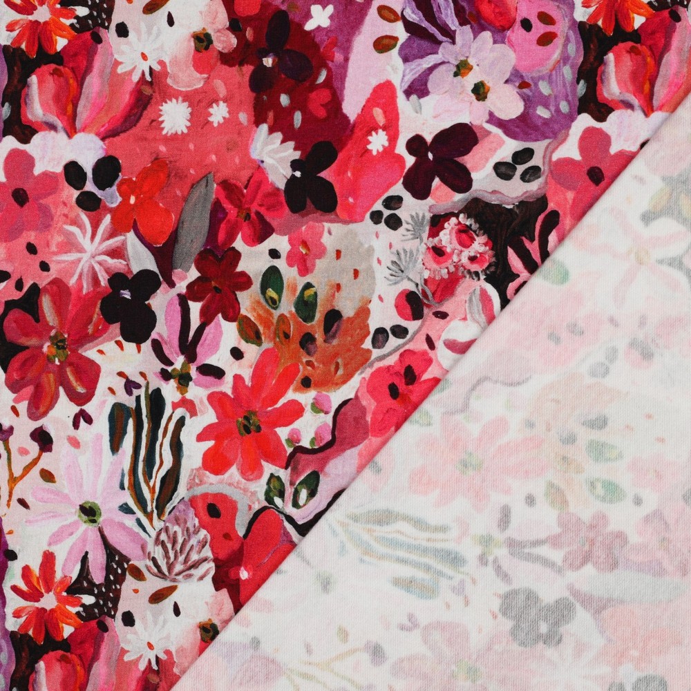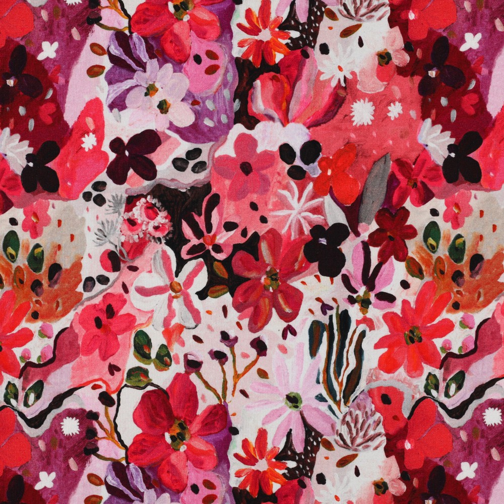 Dyk ned i den kreative designverden fra Nerida Hansen: Dette børstede sweatstof begejstrer med en levende rød tone, der straks fanger øjet. Det moderne, kunstneriske digitaltryk-design ligner malet og giver dine syprojekter et udtryksfuldt, individuelt præg.