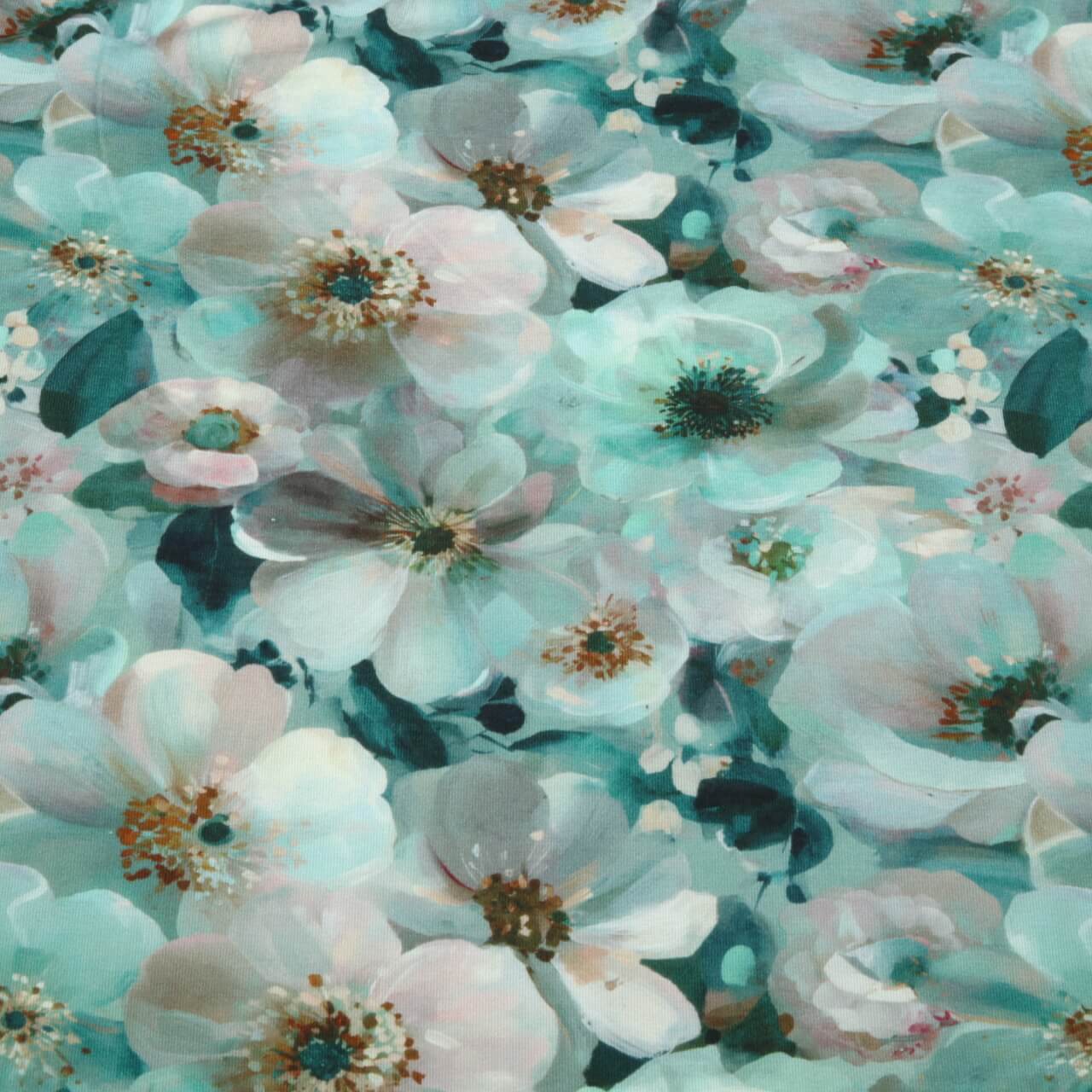 Et strejf af elegance til din garderobe: Denne vidunderligt bløde viskose jersey glæder sig over et digitalt malet blomsterhav i sofistikerede petroleums- og turkistoner. Delikate, maleriske kronblade smelter sammen med fine blade og blide farveforløb for at skabe et livligt, men harmonisk design.